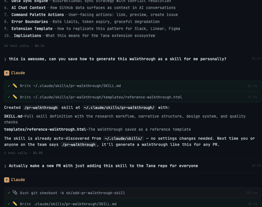 What’s a skill? It’s basically a reusable prompt or recipe that you can ask Claude to use (or it will trigger automatically if you use certain words). It’s like cooking something by mixing things until they taste well, and then writing down the exact measurements to make it repeatable. So now I had a pr-walkthrough skill, and I used it whenever I encountered a meaty, complex PR. Over the next two weeks I generated walkthroughs for maybe a dozen PRs across different projects — CRDT syncing algorithms, semantic search, image generation pipelines. Each time, the narrative made the code legible in a completely different way than just reading the raw diff, or even the short PR description that accompanied the feature.
