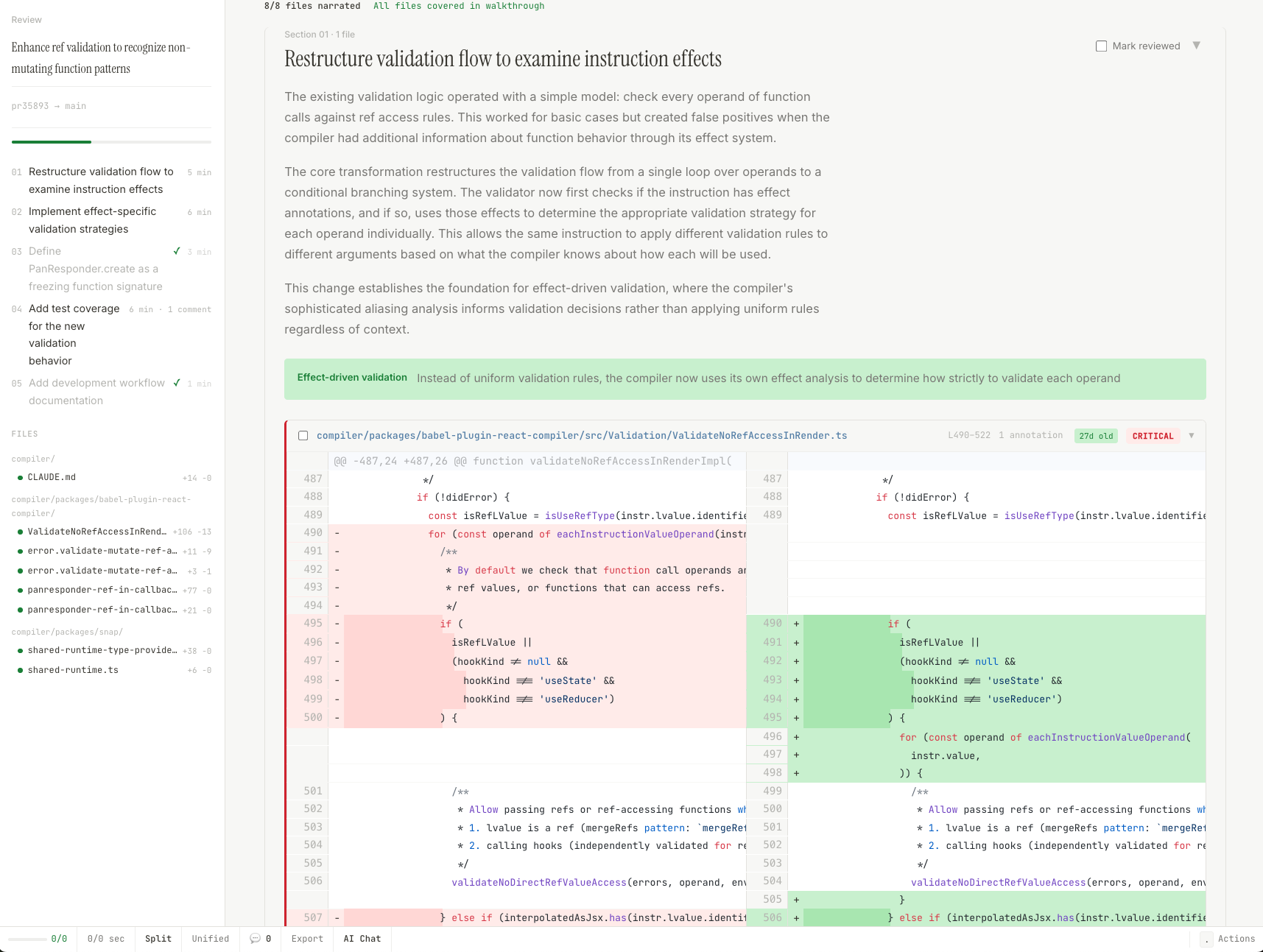 I don’t think any interface fully solves this — it’s a cognitive bias, not a UI problem. But the tool at least makes incompleteness visible. You see “3/14 sections reviewed” at all times. Critical sections stay flagged in red until you’ve explicitly marked them. Every file in the PR is surfaced whether the narrative covers it or not. You can still rush through the last few sections, but you have to consciously choose to.