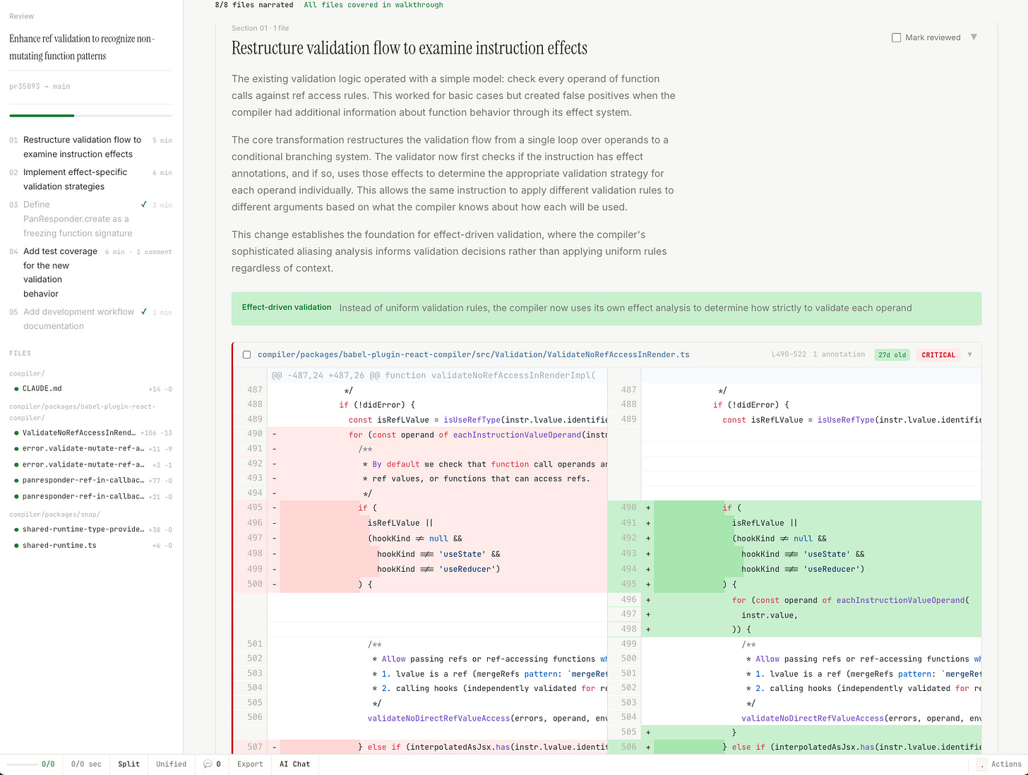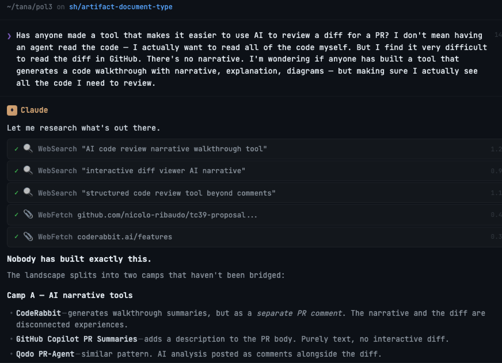 No. There were tools that generated AI narratives about PRs (CodeRabbit, GitHub Copilot's PR summaries) — but they produce a separate comment, disconnected from the diff itself. And there were good diff viewers — but with no narrative structure. Nobody had put the AI-generated narrative inside an interactive diff viewer. Which, I mean, seemed like the obvious thing to do?
