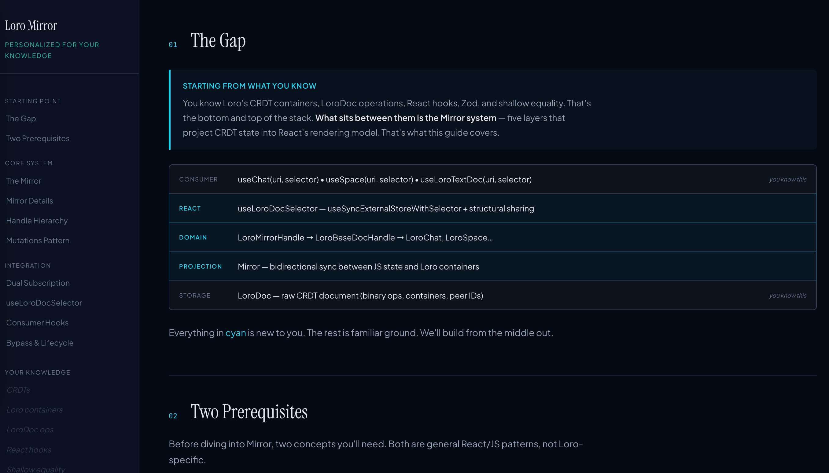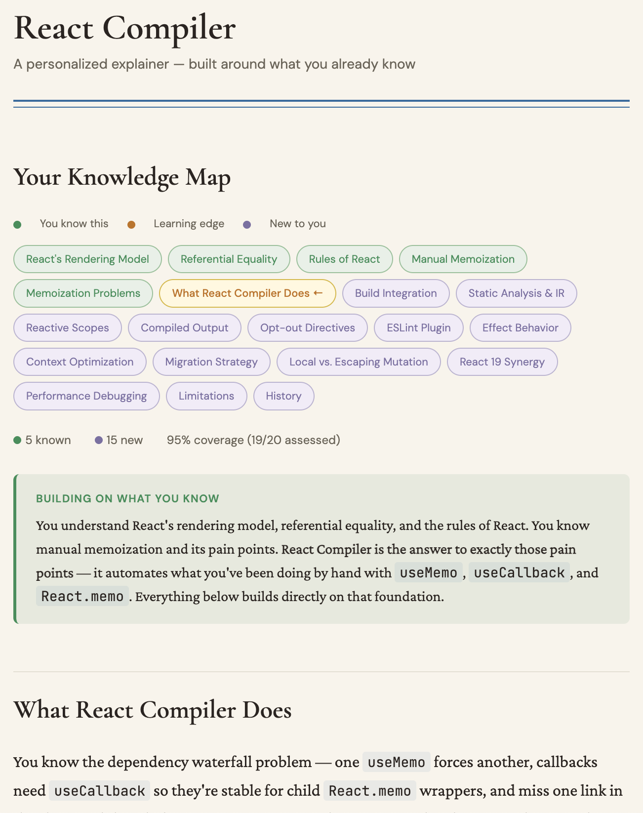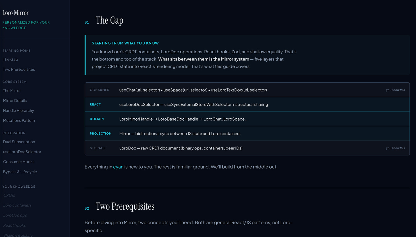 The obvious application for PR review: before generating the walkthrough, probe the reviewer's familiarity with the relevant concepts. If you already understand how the CRDT syncing works, skip the background and focus on what's new. If you've never touched the auth layer, give deeper context there. Instead of one-size-fits-all explanations, you get explanations shaped by what you actually need to learn.