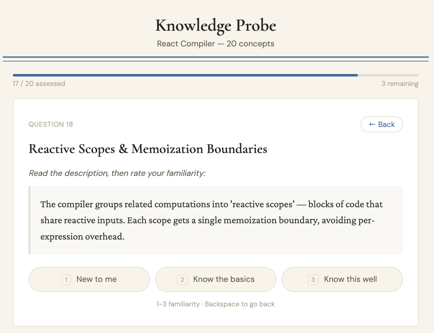 For a reading app I'm building (Petrarca — a sort of knowledge-aware read-later tool), I needed a way to quickly figure out what someone already knows about a topic. The system uses Bayesian belief propagation on a knowledge graph: it asks you a handful of targeted questions about concepts in a domain, propagates your answers through prerequisite relationships, and builds a rough profile of your understanding in about four minutes. I've tested it on things like CRDT synchronization and React internals — it's surprisingly good at figuring out where your knowledge drops off.